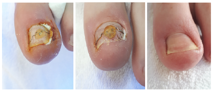Na drugi sliki je vidno izboljšanje po 14. dneh nošenja VHO sponke. Na tretji sliki je noht po 6. mesecih zdravljenja. |