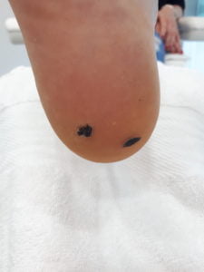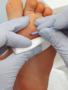| Nanos “lapiza” | Po končanem nanosu srebrovega nitrata na bradavico | Stopalo po končanem zdravljenju |